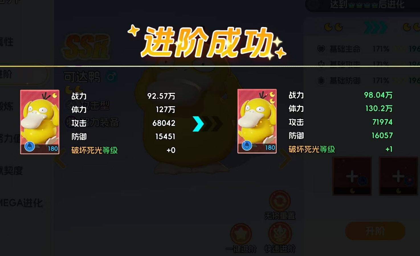 可达鸭的养成难度不算高,毕竟它是初始品级为SSR的宝可梦,即便是通过常规召唤也能获得不少本体,所以很容易就能升到高阶。而在装备上只要注意把有雨阵营加成的智力装备给他就行,若武器上有它的专属特效则更好,没有也不会让它的伤害低上太多。此外,可达鸭由于单卡强度很不错,且自己一人就能完成输出和控场两大重任,所以它可塞入任何对攻击型宝可梦有需求的队伍里,配队极其自由。