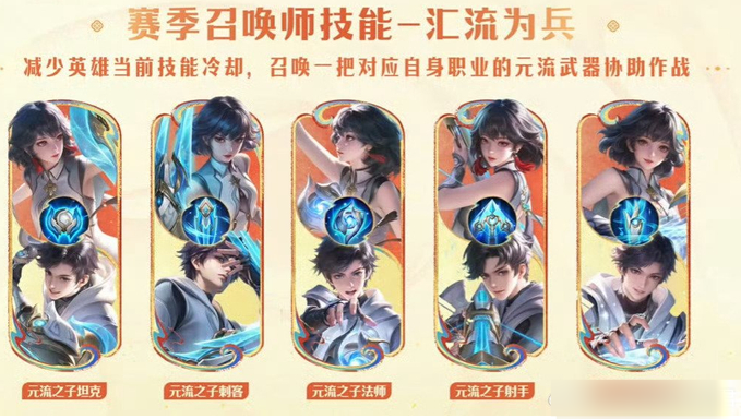 王者将在s43赛季上线新的召唤师技能汇流为兵,新赛季专属召唤师技能太顶了,根据携带职业自动解锁对应元流效果,坦克携带会获得元坦大招,团控拉满;刺客携带解锁元刺斩杀效果,残血收割稳了;法师携带获得元法大招,爆发直接拉满;射手携带触发元射2技能,可击退英雄保平安;辅助携带解锁元辅大招,减CD还能抬血,全职业都能适配!