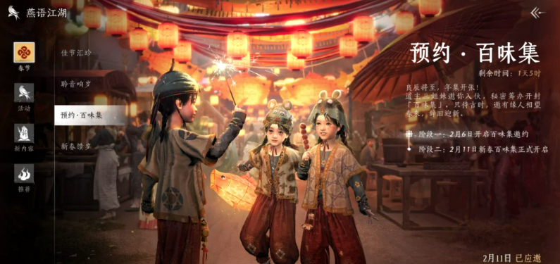 燕云十六声百味集活动有什么?燕云十六声的滹沱地区镇守全部解锁完成了,这标志着不见山的最终章节已经画上句号。不过游戏的精彩内容可没有停下脚步,新的故事篇章马上就要和大家见面。今天小编就带来燕云十六声百味集活动介绍。燕子在2月11日这天,准备了丰富的更新内容,新外观新活动一起来袭,让这个新春佳节变得更加热闹。