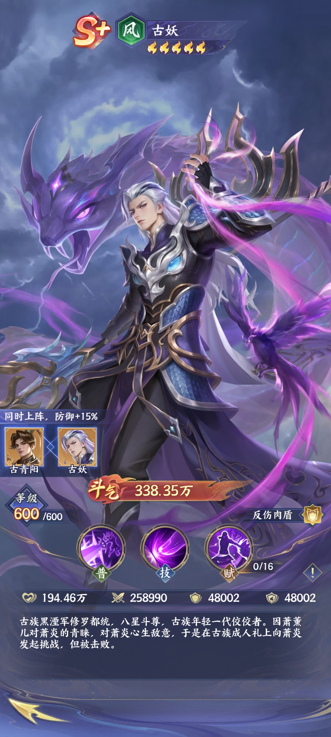 要说古妖,他其实作为肉盾,在整个游戏当中一旦被挨打之后,他就会出现反伤的情况。另外它的防御也能够达到减伤的目的。而他作为S+级别的英雄,玩家获得古妖之后,其实也需要合理的运用他的甲盾,通常情况下可以使受伤害减少,并且还能够叠加,而每次行动之后,它的层数就会减少,也能够有效地施展技能大寂灭指,在这样的情况下就能够有效的攻击敌人,并且还能够直接形成了高额的伤害。