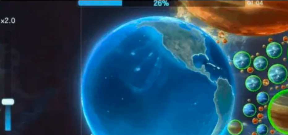 这次的玩法是把玩家,丢进一个到处都是星球的宇宙空间里,然后要做的就是,不停地吞掉其他星球让自己变大。操作方式倒是简单,点击屏幕的某个方向,球体就会往反方向喷气然后飞过去,就像火箭发射那种感觉。喷射的速度可以自己调,玩一会儿就能找到手感了。