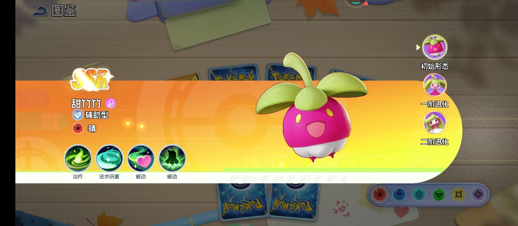 当大家在第1次看到它时,很难和女王两个字连接在一起,就好像是一颗刚刚摘下来的山竹一样。作为辅助型的宝可梦,战斗的方式主要是以温柔作为核心,可以用枝叶去给队友疗伤,用柔和的能量波动去干扰敌人,它的存在就好像是丛林中的一缕清风一样,在紧张的战局中,总是可以带来一丝慰藉。但温柔并不是软弱,在战斗的过程中就可以逐渐的成长,体内的力量也会慢慢的觉醒。