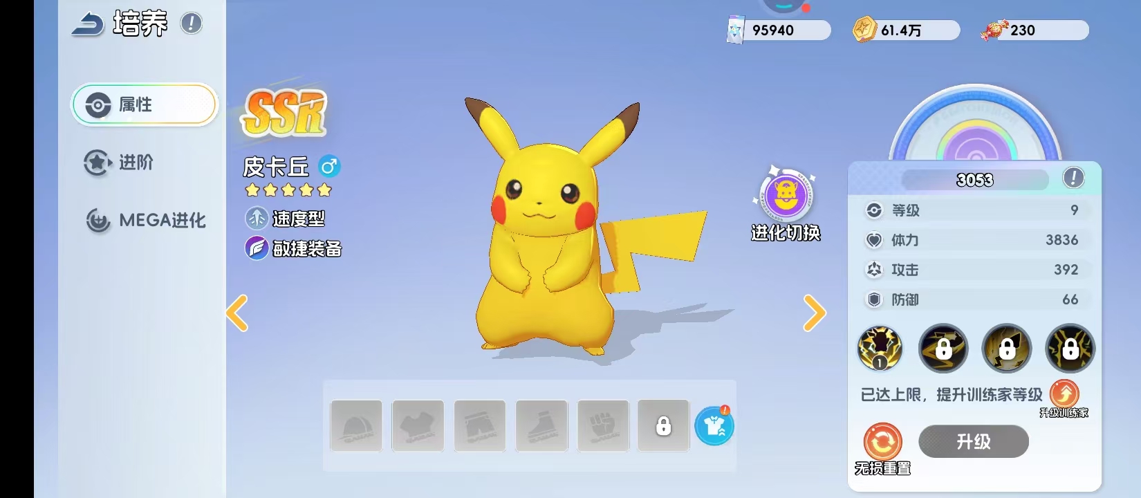 当玩家在获得皮卡丘之后,等级成长就会影响到速度,还有攻击面板。在进阶系统中,可以将基础生命,还有防御属性从原本的115%提升到149%这就是一个改变的关键。每一次的升阶都意味着在战场上,无论是输出上限还是生存能力都可以得到明显的提升。在装备列表中可以选择绿色短巾或者是蓝色牛仔帽。这一类敏捷装备就成为皮卡丘的主要选择,蓝色牛仔帽就可以带来可观的敏捷加成,强化速度优势。