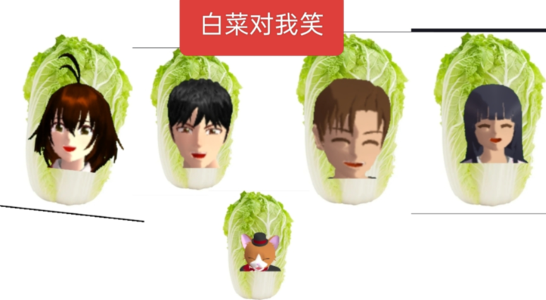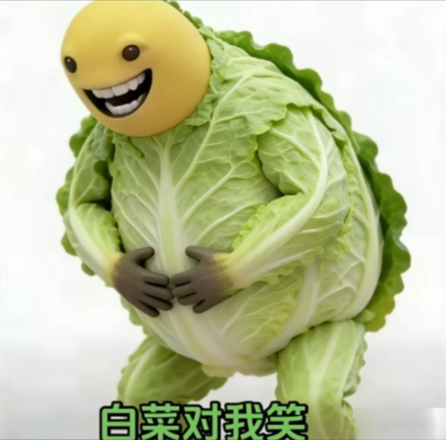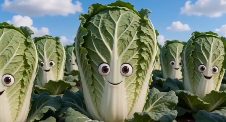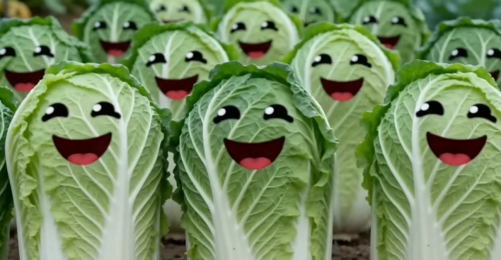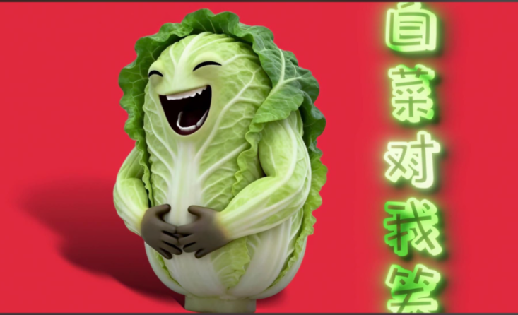 AI白菜梗图:用AI生成各种带笑脸的白菜,配上夸张表情和背景音乐,画面和声音的反差感拉满