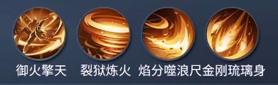 其中火莲印是群体火属性伤害技能,附带击飞效果,释放速度也比较快,输出的时候能够打到的范围也广,而焰分噬浪卷是一个单体的火属性伤害,附带持续火焰灼烧效果和减速效果,灼烧伤害还能在场内得到提升的增益,这也是萧族技能当中焰分噬浪尺的衍生效果,而焚天煮海是范围比较大的火属性伤害技能,附带击退效果,范围比火莲印更搭一些,同时伤害也更高,适合团战里面用来打群体爆发伤害,又能通过击退效果,将敌方阵容给打散,除此之外后期的一些补充选择大家也可以从这类效果当中进行选择,只要附带灼烧效果,大家就可以用来替代焰分噬浪卷作为单体输出的备选技能。
