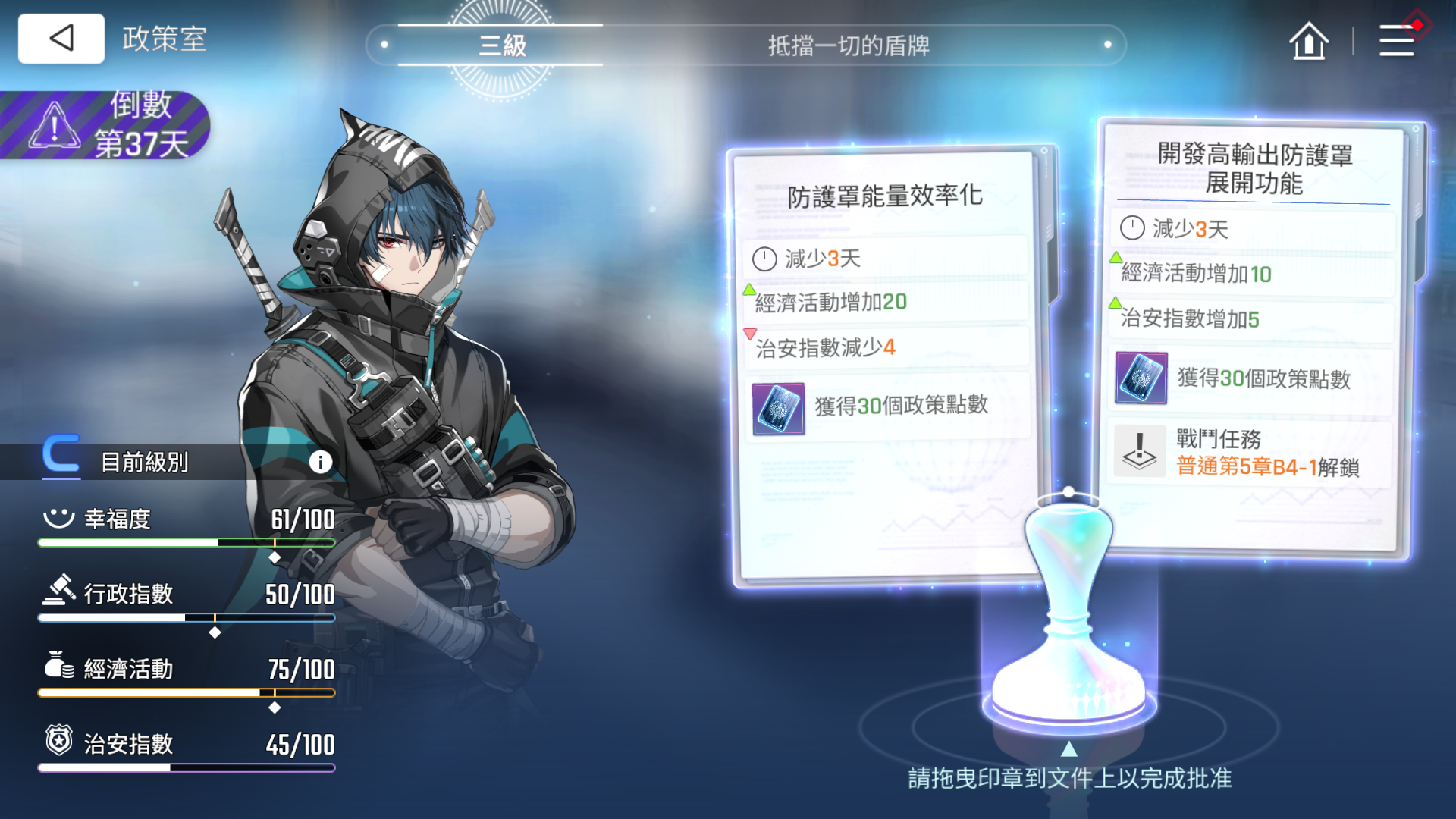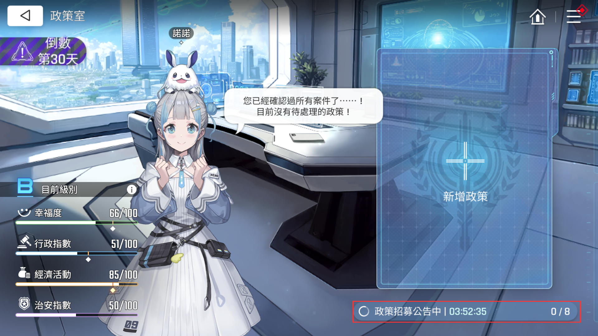 诺诺商店中的商品兑换所需的代币是特殊的“政策点数”,主要可以在政策室通过完成一系列的政策报告书任务来获得。政策室市会开启一个倒计时时间不定的灾难,玩家们需要根据自己想要的奖励和达成目标的难易程度来进行选择自己想要挑战的任务。在任务中,玩家们需要保证行政指数、经济活动、治安指数三个指标达标,而政策书就可以在提升数值的同时让玩家们得到一些政策点数和额外的资源奖励。现在单次任务可以获得的政策点数不同,有20点和30点等,进行合理的规划,可以大大提升整体的获取效率。