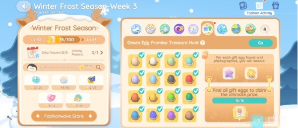 在收集到第16个蛋的照片后,你将立即接到Naughty的电话。他说他会把配方给你,但配方并不会自动解锁,需要在心之乐园获得温泉蛋配方,你需要从屏幕顶部(雪人图标)打开时尚浪潮活动应用,并如图所示,从蛋类收集页面领取。