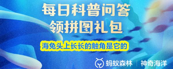 海兔头上长长的“触角”是它的?【神奇海洋】2026年2月28日新题目已开答!正确答案现已公布,点击领取拼图,一起为修复海洋生态贡献力量!今日正确答案是:【嗅觉器官】。海兔头上有一对长长的“触角”,这是它的嗅觉器官,能探测水中的化学信号,帮助它寻找食物和识别同类。
