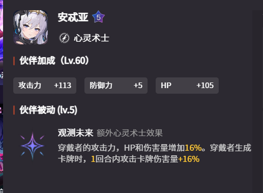 德蕾莎的辅战员选择以增伤属性为主,最好的是安忒亚。安忒亚的被动能够使穿戴者的攻击力、hp和伤害增加16%,并且使觉得生成的攻击卡牌伤害量在一回合内提升16%,十分契合德蕾莎高频生产匕首卡的特性,能够大幅度的提升她的战斗力。而德蕾莎的队友选择则需要注重是否可以提供额外行动点和提升过牌能力,当前版本拥有高额恢复能力的米卡则是她的理想搭档。能够跟随队友进行额外攻击的雨果也能与其形成搭配,一同实现高频多段的高输出。