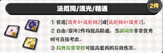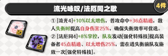 二件套的选择上,需要根据四件套的驱动盘进行考虑,在选择【法厄同之歌】时,可选择【自由蓝调】这类提供异常精通的驱动盘,选择【流光咏叹】时,则需要选择【法厄同之歌】提供异常掌控来提高【异放】伤害加成比例