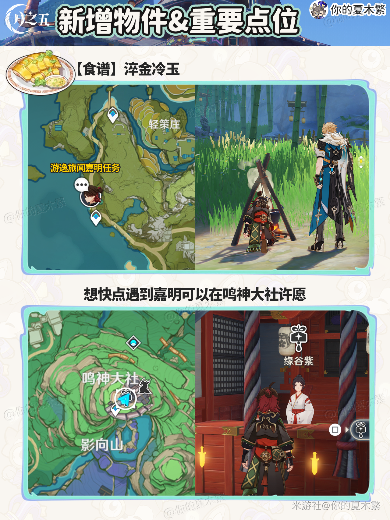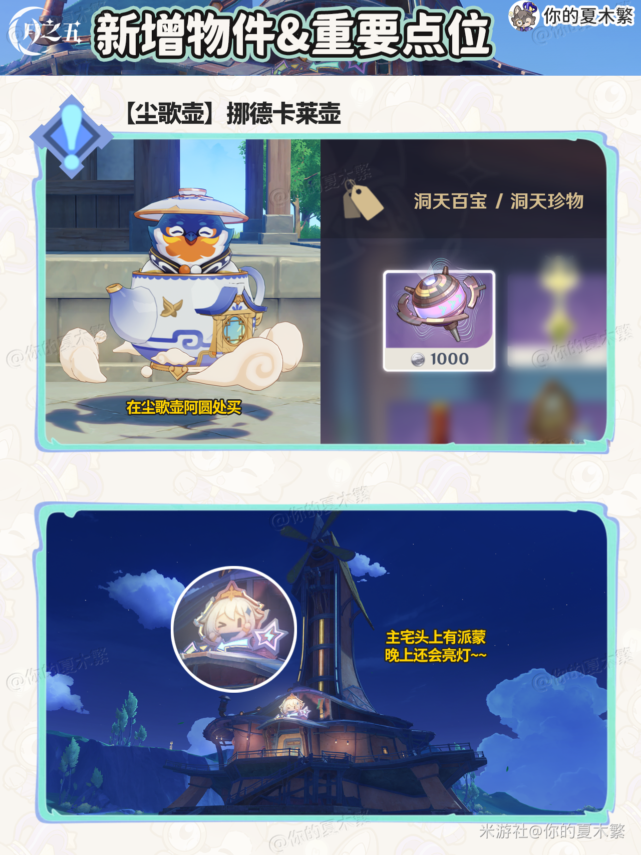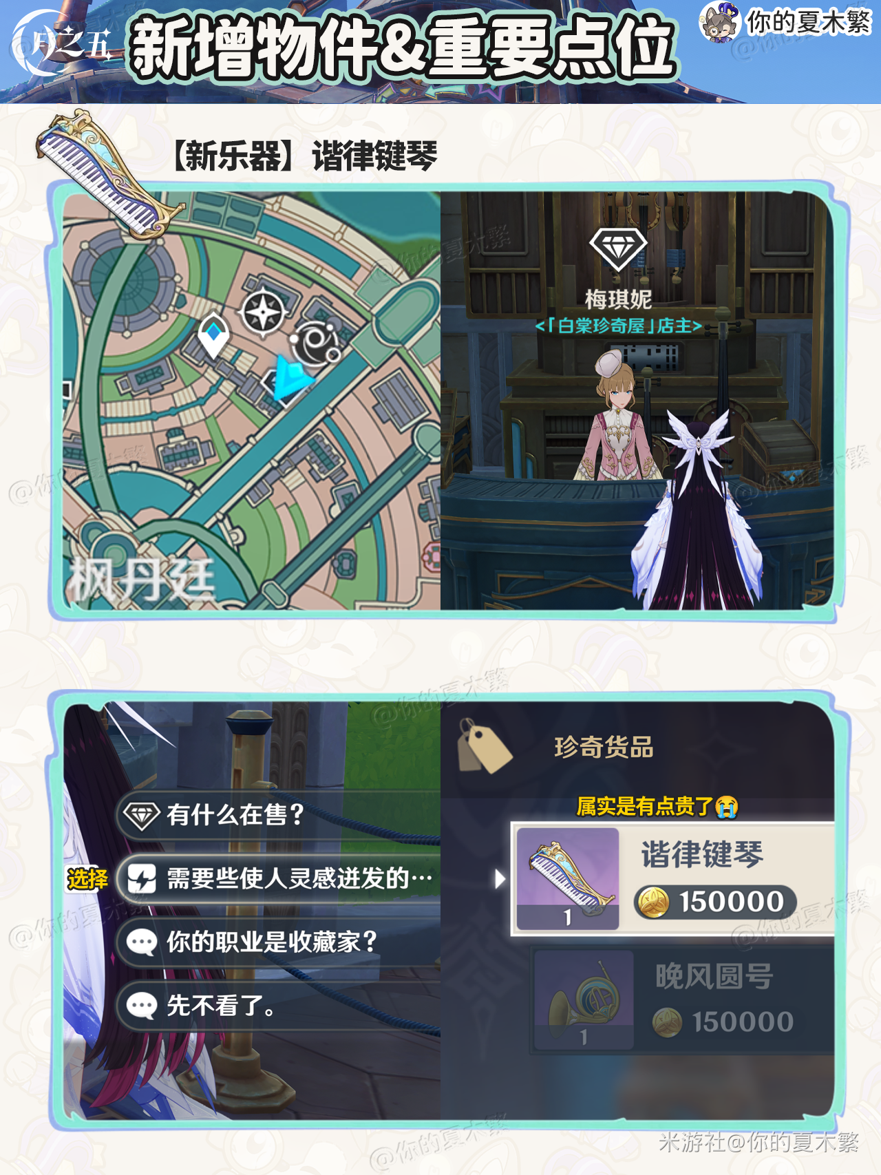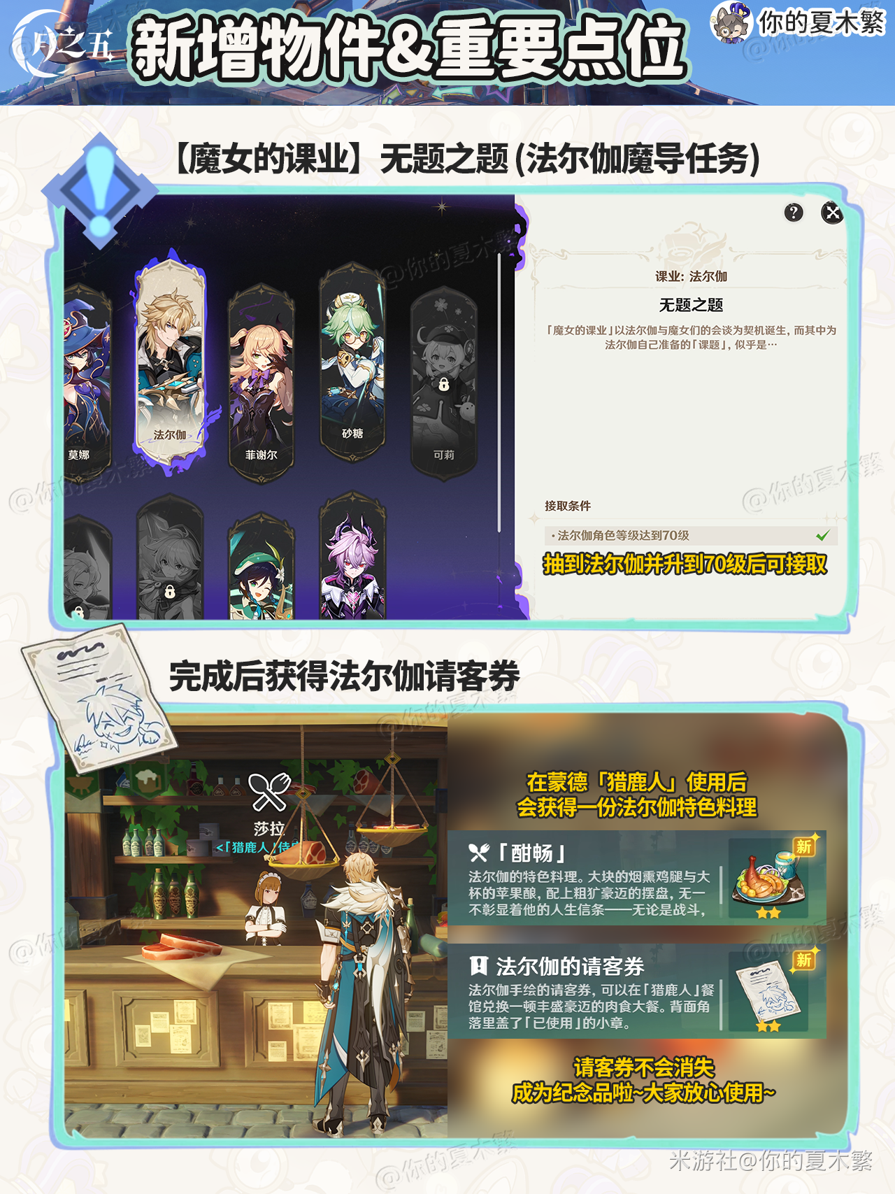原神新增物品点位合集,下文为大家带来玩家“你的夏木繁”分享的【月之五】新增的物品收集,包含:新增食谱×1,新增法尔伽专武武器外观,新增法尔伽魔女课业,新增传说任务,新增挪德卡莱尘歌壶,新增乐器。