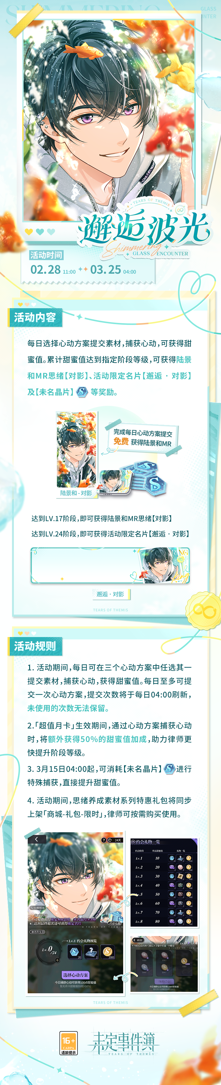 未定事件簿邂逅波光限时活动什么时候结束,邂逅波光活动时间为2026年2月28日11:00-3月25日04:00,律师每日通过选择不同的「心动方案」提交素材,捕获心动,可获得甜蜜值。累计甜蜜值达到指定阶段等级,可获得陆景和MR思绪【对影】、活动限定名片【邂逅 · 对影】及【未名晶片】等丰厚奖励。