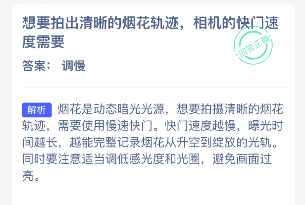 要拍出清晰的烟花轨迹,相机的快门速度需要?支付宝小鸡课堂开课啦!每天花一分钟答题赚饲料,喂喂小鸡就能贡献爱心啦!轻松又意义十足!2026年3月2日蚂蚁庄园的小鸡课堂题目正确答案是【调慢】,想要拍出清晰、完整的烟花轨迹,相机快门速度需要调慢。只有慢快门才能把烟花炸开的整个过程记录成连续光轨,快门太快只会拍到零散光点。