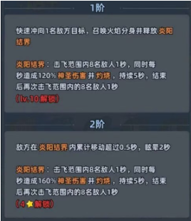 炽焰舞姬核心的战斗力主要是靠两个技能支撑,第1个阶段就可以打出不俗的效果,在提升等级之后,还能拥有翻倍的强度。一技能是核心的输出技能,在针对单个目标时,丢出扇子就可以造成200%的神圣伤害。扇子在掉落在地时,还能灼烧三个敌人,然后打出200%的神圣伤害,同时可以给随机一名敌人挂叠扇标记。这一个标记就堪称小怪克星,目标准备攻击时就会直接被魅惑1.5秒。而且禁疗还可以让敌人的治疗因此而失效,灼烧就可以直接定住小怪0.5秒,唯一遗憾的是这个技能对Boss没有效果。