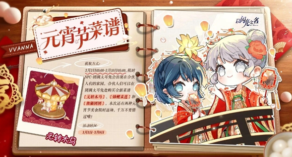 以闪亮之名3月3日至10日元宵节期间,限时NPC“团圆大耳兔”将出现在家园中,玩家可前往购买全新菜谱【元转木马】【锦鲤采莲】【熊猫团团】,同时还有两款往期元宵美食限时返场,不要错过。