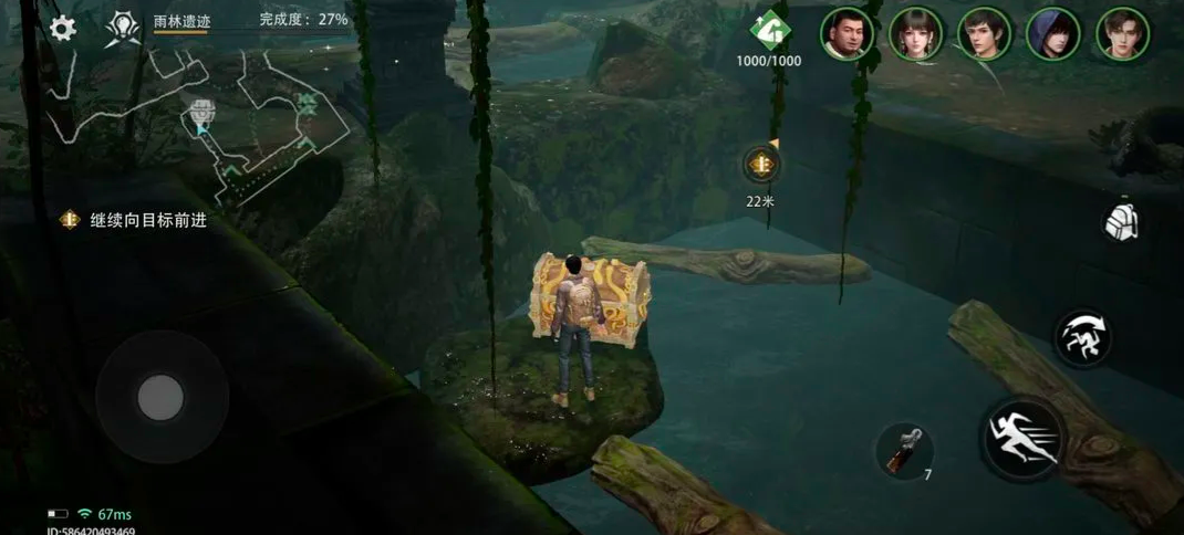 该任务位于西王母国雨林遗迹章节。进入地图后,需先传送至对应区域,随后沿主线引导抵达密林地带。此处存在多座由天然岩块堆砌而成的石桥结构。参考图示位置,建议优先编入吴邪作为主力操作角色——其专属解谜属性可显著提升交互响应效率;同时务必提前激活罗盘装置,该道具可使吴邪解谜成功率额外提升20%,是完成后续机关联动的基础保障。穿越浅水河道后,连续跃过两处山岩间隙,即可在右侧山体遮蔽下的水面上发现首个漂浮宝箱。