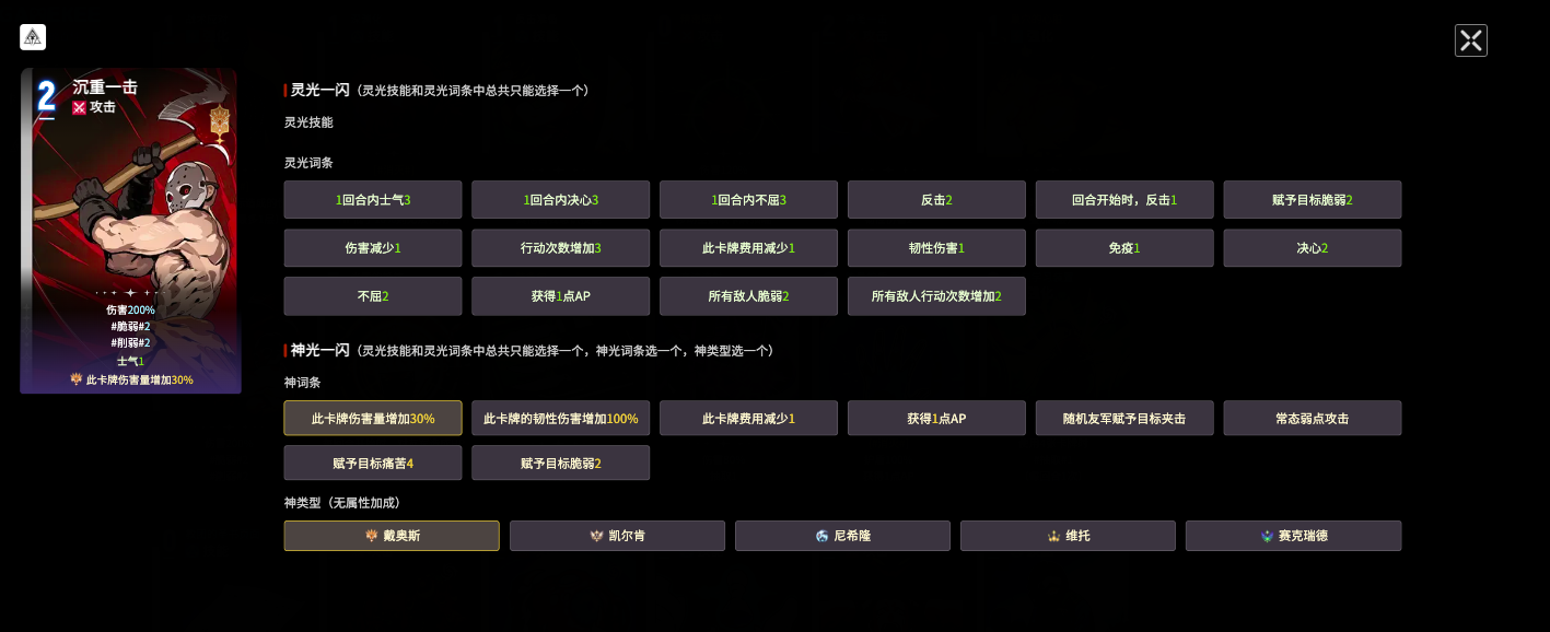 第三张卡牌”沉重一击“,该卡牌可赋予戴奥斯、尼希龙使用这张卡牌不仅可以增加200%的伤害,而且可赋予目标2点脆弱和2点虚弱,能够让对方在掉血的同时快速失去力量,目前比较推荐使用的神词条是”获得1点AP“、”卡伤害量增加30%“,有了这两个神词条的辅助,不仅可以再度增加敌方的流血量,而且还有机会累计刷卡次数。