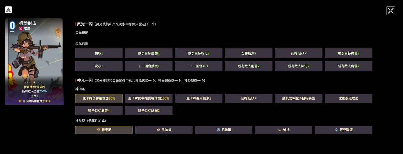 最后一张必备流血伤害卡牌——机动射击,作为一个高攻击性的万金油卡牌,开展后即可使用,可对敌人增加200%的伤害,让敌方快速流血,在对战过程当中比较推荐的灵光词条是”下一回合抽1“,“所有敌人削弱2”;而神词条则是“此卡伤害量增加30%”、“此卡任性伤害增加100%”。