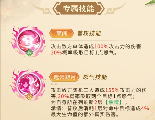 貂蝉的技能主要就是围绕控怒,还有叠伤。离间属于普通攻击,在针对单个敌人时就可以造成100%的攻击力伤害,并且还有20%的概率能吸走目标一点怒气,主要是克制那些靠大招打输出的敌方核心。遮云避月属于一个怒气技能,这更是核心中的核心,随机攻击敌方三人,就会造成155%的攻击力伤害,并且还有30%的概率可以吸取两个目标各一点怒气。血量越高,那反噬也就越狠,同列的队友还能共享这一个效果。