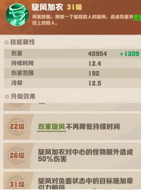 这个技能其实局内很少会选,双重龙卷完全没必要,单龙卷就够用了,搭配上百分比宝石,就能打出百分比伤害效果。所以龙卷风不用升太高,实在想升的话,就拉到31级,31级会解锁牵引力翻倍,偶尔用用还是有点作用的,平时的话,升到6级就够了。