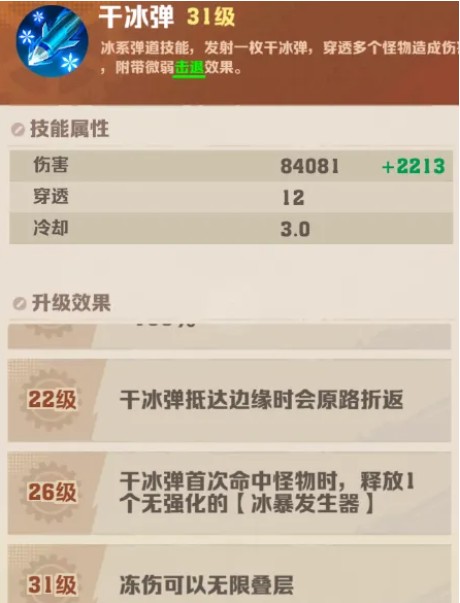 主要作用是解锁无限冻伤机制。升级到31级后,干冰弹的冰冻侵袭词条会产生质变,冻伤可以无限叠加,实测上限为99层。不过要注意,干冰弹本身并不直接赋予冻伤效果,需要激活冰冻清洗词条才有冻伤效果。