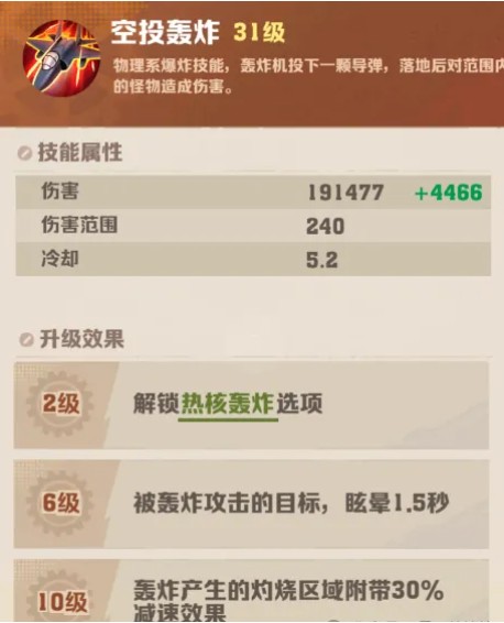 有概率在同位置连续投放两枚炸弹。空投轰炸是物理系爆炸技能,随着等级提升,效果增强。升到31级时,这一特性使其伤害输出能力得到提升,尤其是搭配空百宝石时,能更频繁地触发对感电目标的百分比伤害,在面对火首领时效果显著。