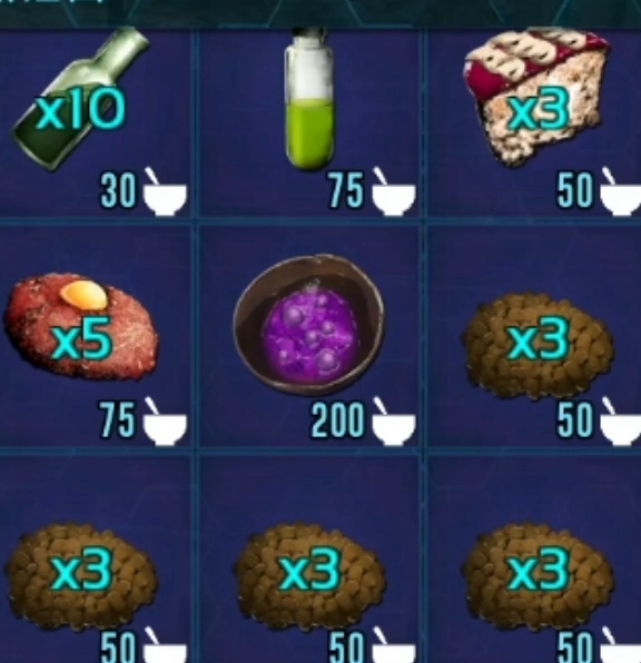 除龟蛋外,其余配料包括:胡萝卜(基础蔬菜类)、优质熟肉干(需以高等级掠食者如恐狼、双脊龙或渡渡鸟肉为原料,经火烤制成)、紫色浆果(常见于温带丛林与山地灌木丛)以及纯净水。其中,优质熟肉干为整套配方中获取门槛最高的成分,建议优先组建专业化狩猎小队,并配置保温箱与移动厨房提升加工效率。