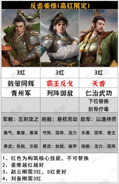 1.阵容的难点在于全员高红,由于姜维3红是比较难的,大部分人的自选箱子都给了张郃和大戟士。