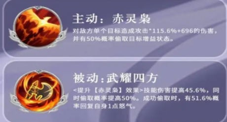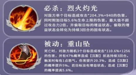 诸葛亮的“电闪雷鸣”是诸葛亮技能中最有代表性的技能之一。智慧用象征的方式出现,诸葛亮这个能力的战术使用,具有很强的精确性以及全局思维。该技能既可以对敌方全体造成大面积伤害,也可以给敌方全体附加额外的持续伤害,是计算超人特有的能力。此技能的伤害可以忽略掉敌人的一部分防御,让人感觉敌人无处可逃,既有战略又有攻击,使用时有一种强烈的进攻感。张郃的五毒嗜血也十分可怕。此技能会造成范围伤害,并带有3回合的持续中毒效果,持久的伤害对于战斗来说是十分可怕的。在敌方防线已经被削弱的时候,它会慢慢地使敌人的耐力下降,为自己的胜利打下基础。