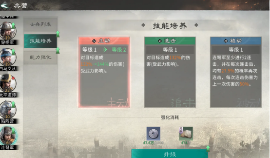 主要的核心特色就是优先提升兵营等级,集中相应的资源培养众多具有特技的士兵。首先要注重的就是兵营建设以及征兵,具体的士兵等级和兵营绑定是非常关键的,士兵等级并没有办法单独提升,完全取决于兵营的等级,当兵营升级之后,士兵便会自动获得对应的等级基础属性。日常征兵非常关键,每天务必都要及时进入募兵所完成征兵,并及时返回兵营,完成升级,士兵的基础属性越强,后续培养收益也就越高。