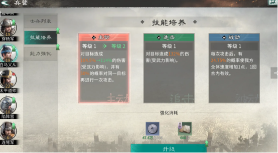 士兵的培养和相应的管理也是非常关键的,在相应的管理界面提供解散功能,可以一键选择没有任何特技的士兵进行解散,即便你包含的士兵属于绝世品质,如果没有任何特技技能通常都有着极低的价值,低于具有特技传奇品质的士兵解散之后。够所获得的强化材料,有助于培养高价值,相应的单位。在具体的培养方面,前期优先提升士兵的技能等级,因为同数量训练心得消耗下技能等级的提升能够明显与能力的强化。在具体的能力强化优先级方面也很关键,技能培养达到相应的进度之后,转向能力进行全方位强化。