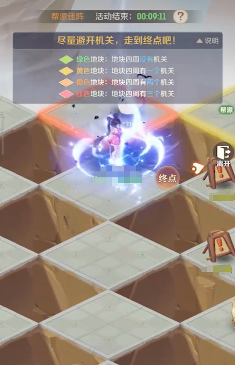 帮派迷阵是限时开放的玩法,它只在每周一、三、五、日的12点和18点开放,其模式与扫雷很相像,需要人们根据地面上各格子的颜色来进行解谜,找出一条安全的线路前往终点。不同颜色的格子所代表的含义完全不一样,其中绿色格子表示周边格子都为安全格,没有任何的机关,黄色则代表周边有一个,橙色则是有两个,红色则说明周边有三个格子存在的机关。要注意,每个格子都只与四个格子接壤,所以玩家在踩到红色格子时,最好原路退回,不要再继续前进,否则必定会触发机关。