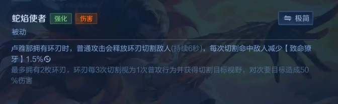 卢雅那拥有环刃时,普攻会释放环刃攻击敌方,提升输出伤害。每次命中会减少1技能【致命獠牙】1.5%的冷却,每3次切割伤害视为一次普攻行为且获得视野,对次要目标还会造成50%伤害。被动主要提升卢雅那伤害和为一技能减少冷却。