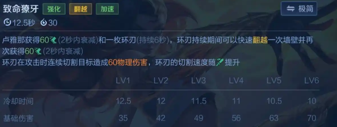 释放一技能后,卢雅那获得60~120点的衰减移速加成和一枚环刃,环刃存在的6秒期间卢雅那可以获得一次翻越墙壁。环刃攻击速度随攻速提升且对目标造成伤害。一技能主要是强化环刃伤害和提高机动性,能翻墙可以拉扯敌方英雄。