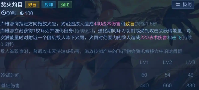 释放大招后立即获得一枚环刃和强化自身,期间强化环刃和受到攻击获得能力,满能力则对附近随机一个敌人降下火雨,造成伤害和击飞,是卢雅那唯一的硬控技能。大招是卢雅那的玩法核心,致盲不管是对线和打团都有非常好的效果。