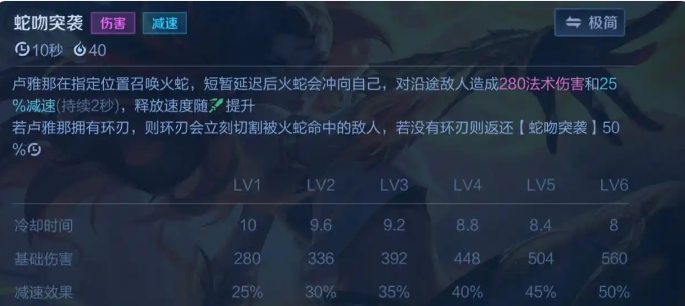 卢雅那向指定方向释放火蛇,对沿途敌方造成伤害和1.5秒致盲。致盲效果下敌方的普攻攻击无法造成伤害,释放技能产生的飞行物将随机偏移命中沿途目标,射手对拼时卢雅那有着绝对的优势。