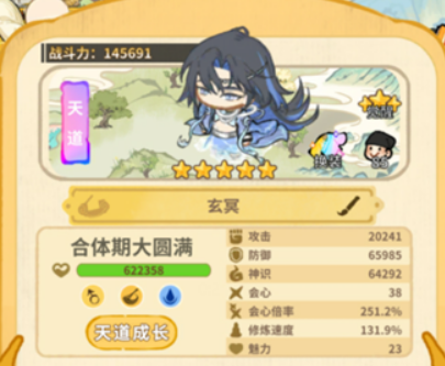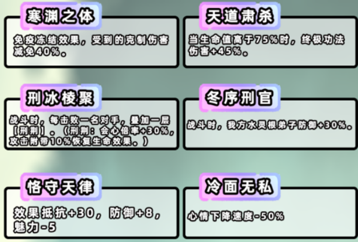 资质进攻端,大招伤害加成45%,击杀敌方弟子后叠加会心倍率和吸血效果。但玄冥神识低、大招系数也不占优势,基础会心又不足,每层刑荆实际带来的增伤连10%都不到,指望玄冥输出不太现实。防御端受克制伤害减免40%,全队水灵根防御加30%,听起来不错,但土灵根输出少,防御减伤在这个游戏里效果本来就被玩家质疑,实际感受比较平淡。玄冥自带30点抵抗且免疫冻结,上场被控的概率低一些,这点算是小优势。