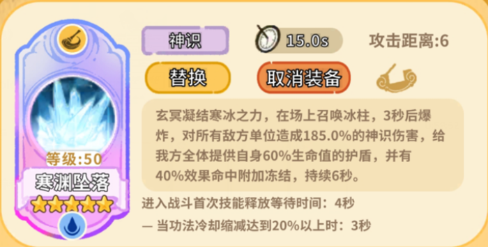 护盾量是寒渊坠落最核心的价值,全体60%生命值护盾折算下来约37万。菩提锤裸伤大概70万,这个护盾相当于挡住了将近一半的伤害。治疗是治疗,护盾是护盾,两者不能互相替代,但护盾能拉高队伍的一击承受线,后排不容易被突然秒掉,给治疗留出反应时间。附带40%概率触发6秒冻结,触发率不算高,不能当成稳定控制来用。但冻结有个特点,护盾和地藏戍卫阵都挡不住,被冻结的单位行动停止、技能冷却暂停,主要时刻能卡掉对面的治疗或者打断输出节奏,偶尔能起到意想不到的效果。