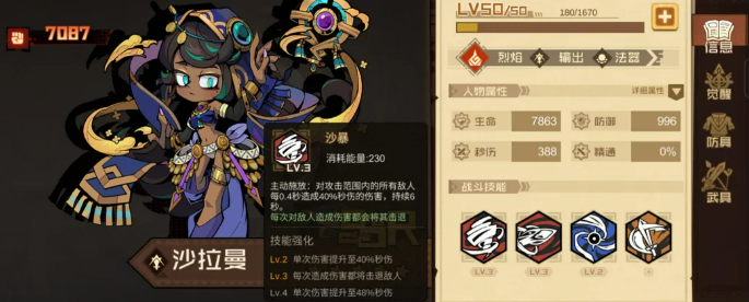 沙拉曼的自动技能叫沙暴,是一个穿透技能,单次倍率不高,但冷却时间极短,基础只要七秒。穿透打到多个敌人的时候,每一段命中都能触发天罚之日的增益,频率很高。如果敌人身上有燃烧状态,伤害还会进一步提高。沙拉曼还有一个被动叫浮游剑,队友每次释放自动技能都有概率跟着触发一次浮游剑,这样等于把队友的自动技能也纳入了自己的输出循环里。