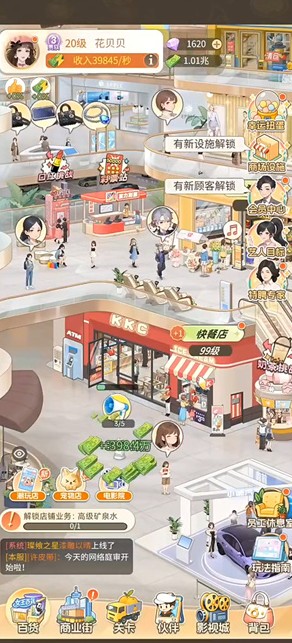 时尚百货城新手怎么玩,上线把所有红点和商业街的活动都过一遍。商战和私人会馆放最后,领完一圈东西,把伙伴升一升再去打,百货城里的生鲜超市、庞物店去进货,电影院去揽客,每隔段时间进去点一下,有上限的。