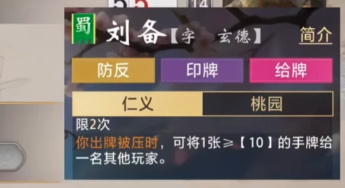 使用仁义的时候要考虑到技能次数和限制,每局最多可以发动两次,转移牌的点数不能大于10点。手牌过此点数之后就无法通过技能传递,玩家要事先安排好手牌和技能的顺序。除此之外,在刘备被动技能中,桃园是仁义消耗完毕第一次才触发的,玩家拿到的非废王手牌数是3张,则它的续航、抗压能力都会提高,从而可以持久支援队伍,关键时刻掌握主动。