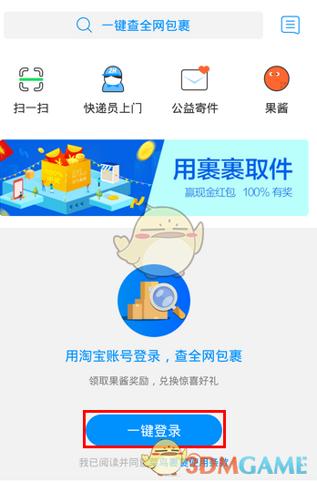 2.菜鸟裹裹打开之后,点击主界面上的“一键登录”按钮,输入你的淘宝账号和密码登录。