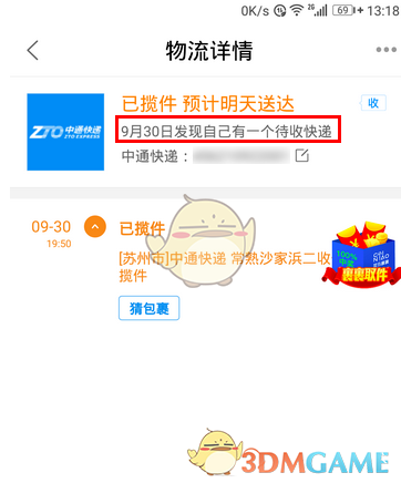 3.登录之后,如果当前你有待收货的快递单,则会在主界面上显示出来。我们点击这个快递单进入,便可以看到物流详情。