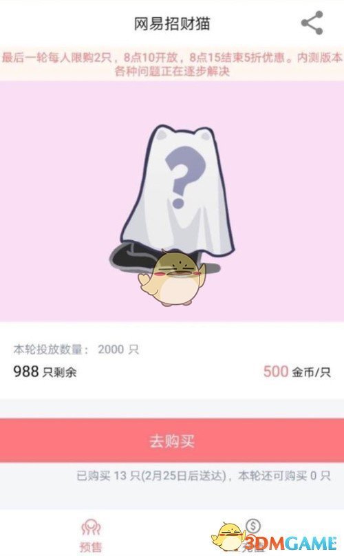 本轮预售仅限网易互动娱乐事业群员工参与,以内部优惠价购买的猫有锁定期50天气,将于2月25日后送达,请耐心等待。