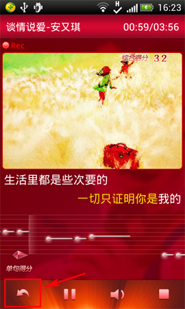 在演唱界面,自己进行演唱,当自己演唱完成后,点击【返回】按键,最后在显示出的界面按【是】按键即可。