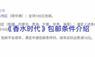 香水时代包邮条件因活动和时间有所不同,非偏远地区一般有小样满减后150元包邮、小样120元包邮、小样80元+任意正装包邮、正装2个包邮等情况;偏远地区满足相应包邮条件后联系客服减1