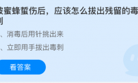 被蜜蜂蜇伤后,应该怎么拔出残留的毒刺?这是支付宝蚂蚁庄园小鸡答题4月11日题目,选择正确答案,答对可获得 180g 饲料,答错则获得 30g 饲料。为了保证正确率,本次给大家带来了