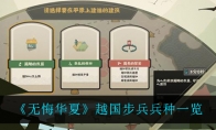 在无悔华夏中每个国家的兵种都是不同的,很多小伙伴都很想知道越国的兵种类型是什么,今天小编给大家带来了《无悔华夏》越国步兵兵种一览,感兴趣的小伙伴一起来看看吧,希望可以帮助到大家。《