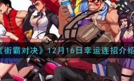 在街霸对决游戏当中,我们在进行招募时可以模拟连招环节,每天都会有幸运连招。那街霸对决12月16日幸运连是什么呢?下面小编给大家带来《街霸对决》12月16日幸运连招分享,感兴趣的小伙
