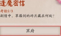 剧情里是草薙剑是碎片是藏在冥府中的。所以答案就是第一个,碎片藏在冥府之中。问题来自于阴阳师的逢魔密信,答对之后会获得奖励。 剧情中草雉剑的碎片藏在何处 1、冥府2、七角山3、大蛇